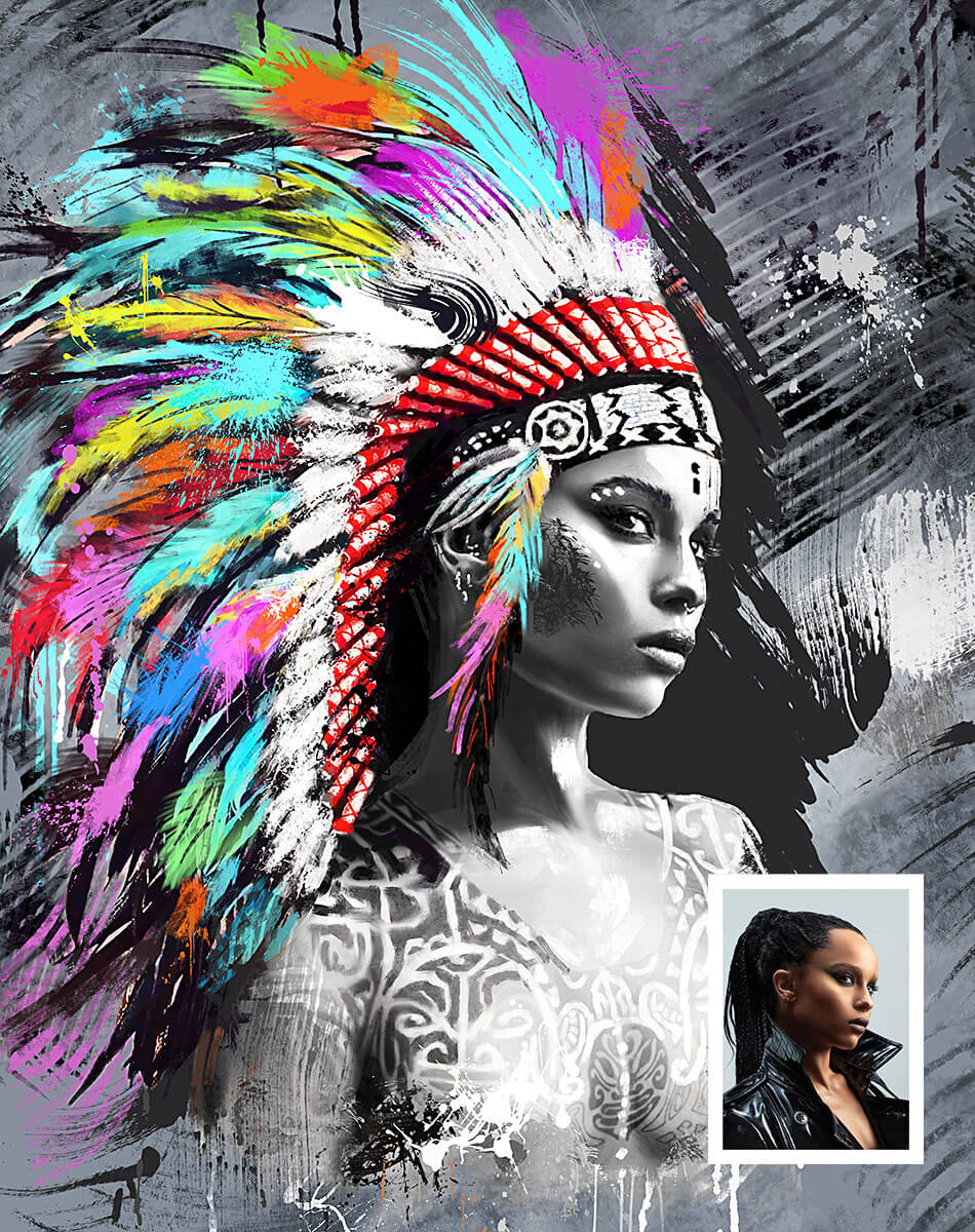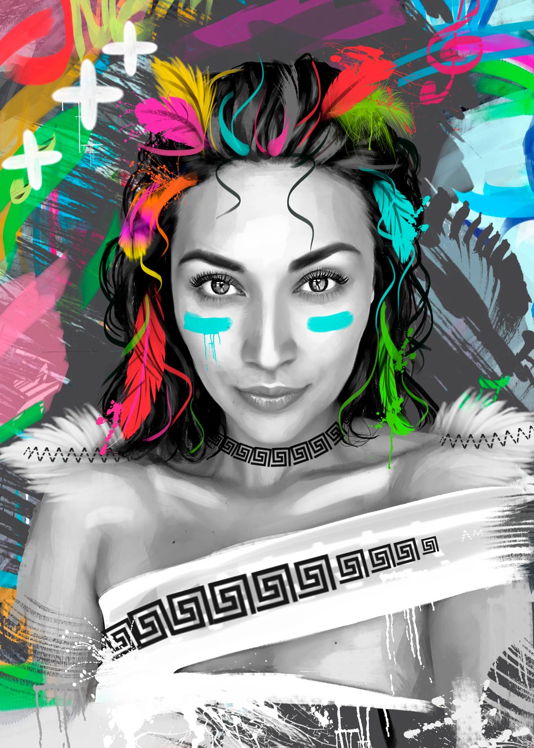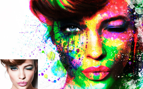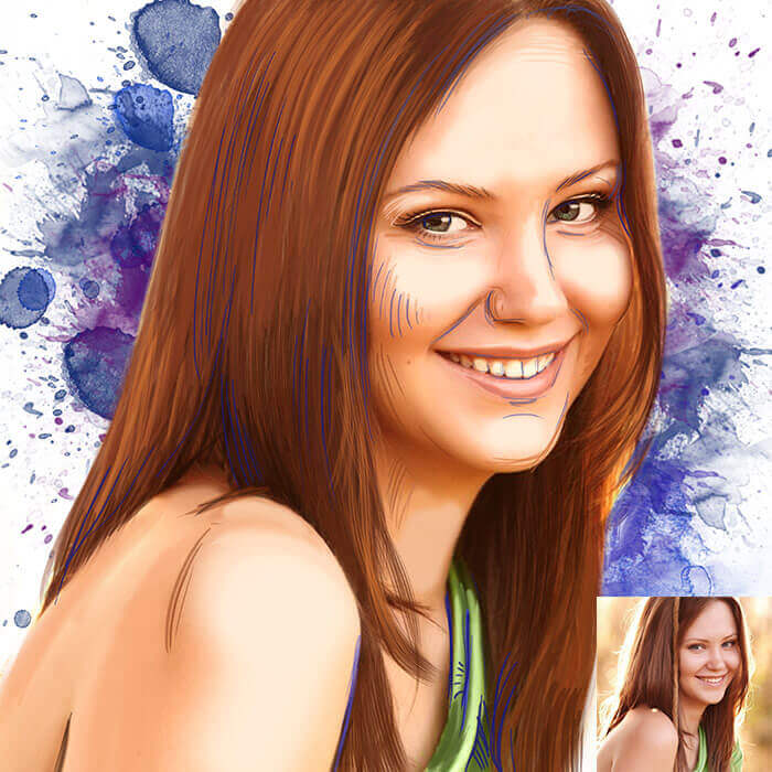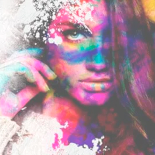 Портрет в стиле цветной туши. Фото обрабатывается специальными кистями и наложениями текстур и цвета. Тем самым создавая эффект цветной туши.